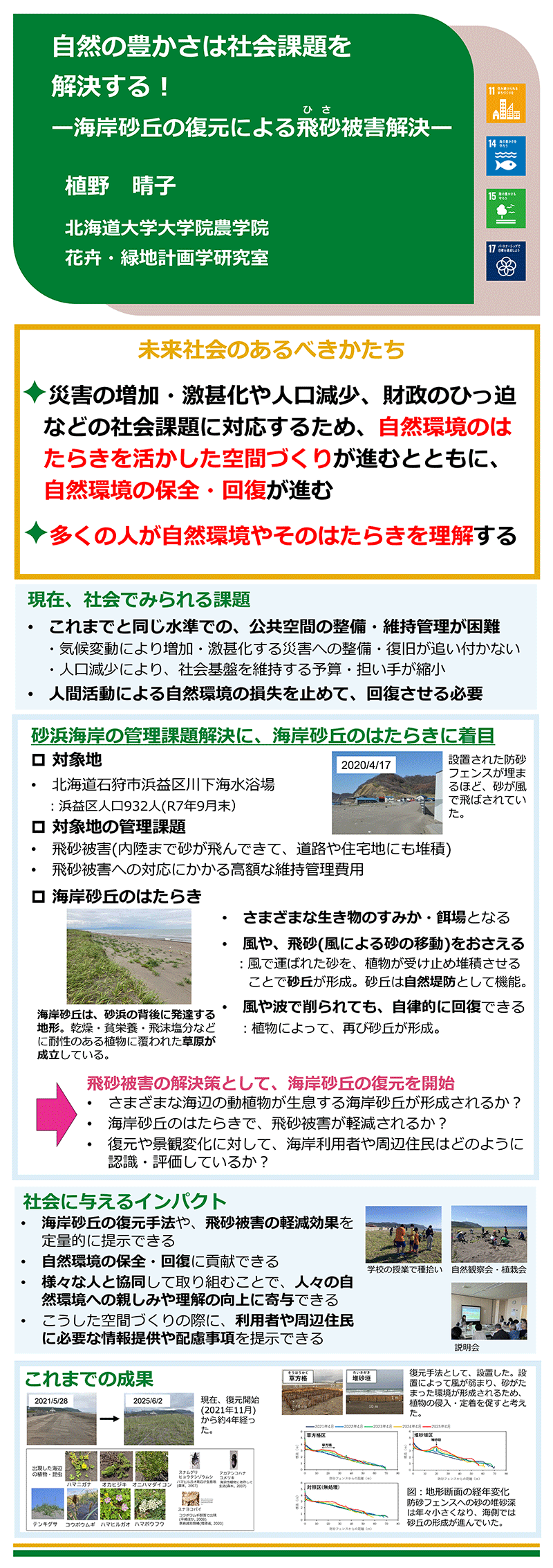 35. 植野 晴子 2025年12月2日 最終更新日時 : 2025年12月2日 pontani 自然の豊かさは社会課題を解決する!ー海岸砂丘の復元による飛砂被害解決ー UENO Haruko : 農学院