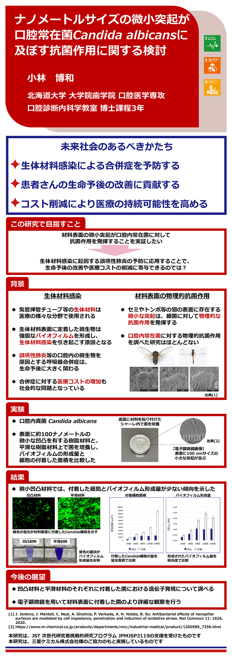 69. 小林 博和 2025年12月2日 最終更新日時 : 2025年12月18日 pontani ナノメートルサイズの微小突起が口腔常在菌Candida albicansに及ぼす抗菌作用に関する検討 KOBAYASHI Hirokazu : 歯学院